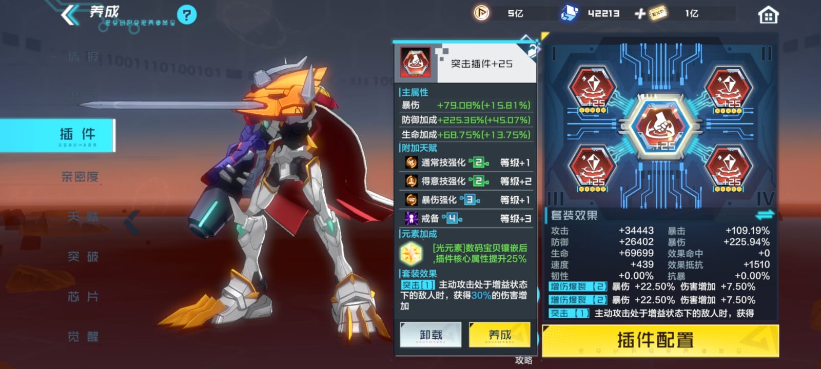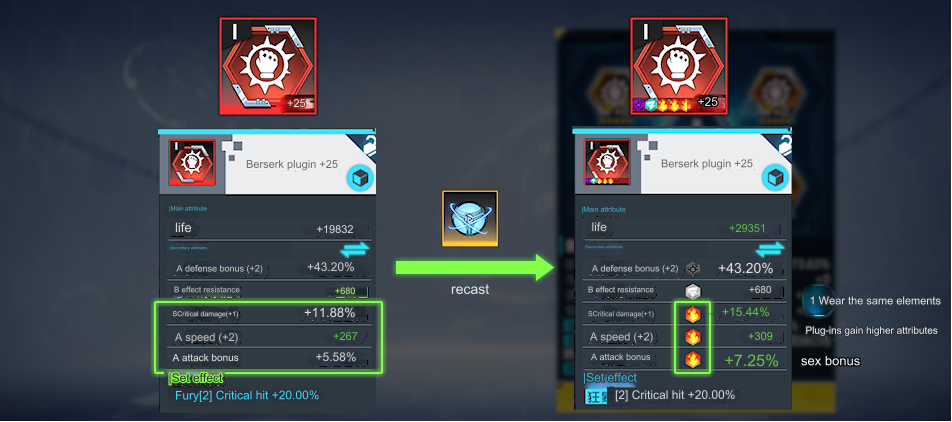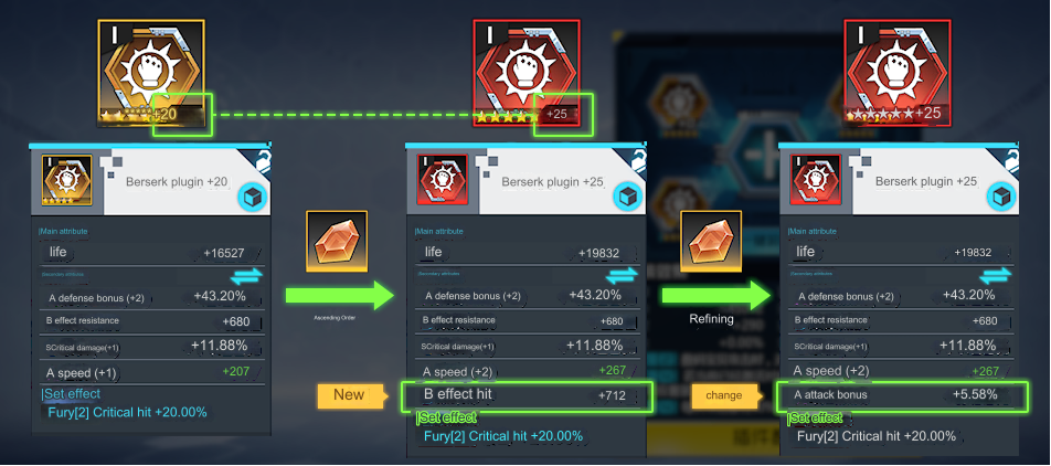 After you hit lvl 20 on a 5-star plugin you can enhance them to lvl 25 and change them to red quality with 25 orange gems giving one extra stat (that can be changed for 5 orange gems and 20,000 Gold).