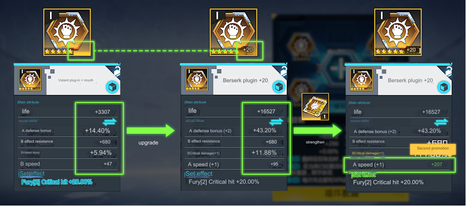 Both sides of plugins and core plugins can measure their strength by the color of the plugins being gold the stronger ones (that can be farmed or crafted) and the stars on the plugin being 5 stars the maximum, you can strengthen the plugin with gold till lvl 20 (and 25 with the orange gem upgrade) and strong even more every stat with cards you can get from the element challenge.